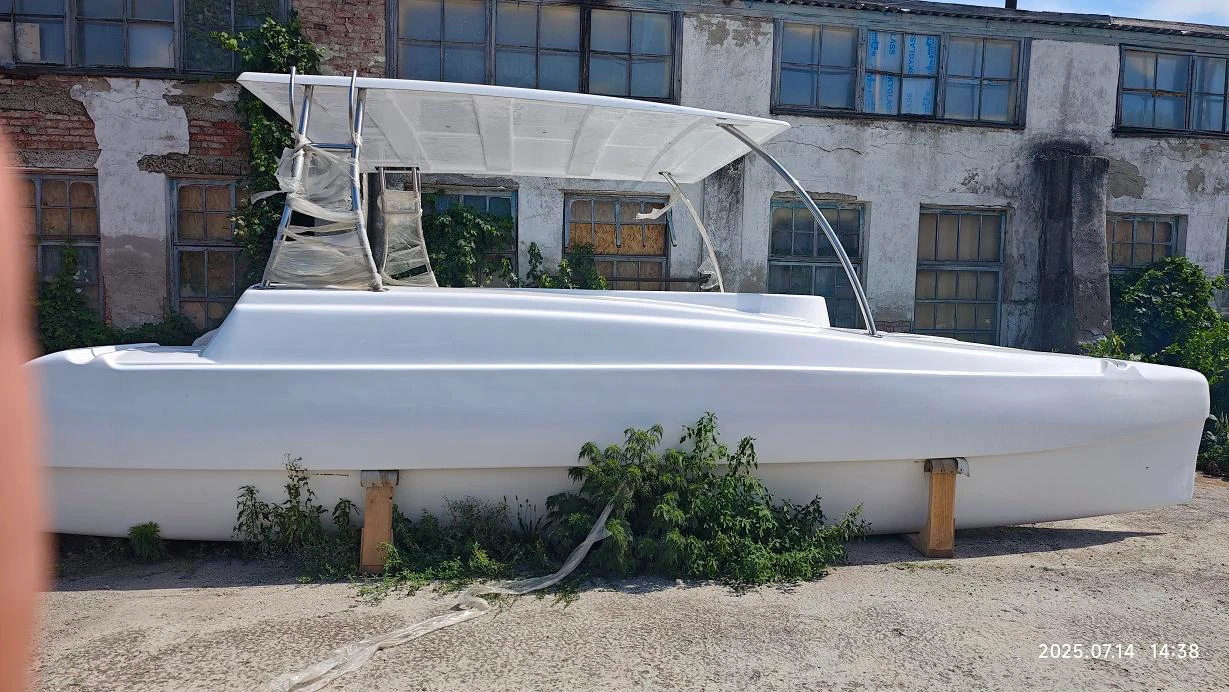 В стандартную комплектацию входит; леера нерж.сталь, поручни спереди, пост управления центральный, бак на 200 литров, топливный индикатор, полукругом сидения с мягкими накладками два люка (вход в боковые баллоны), крыша пластиковая на весь катамаран установелнный на опоры из нержавеющей стали, труба. ходовые огни, панель выключателей, две откач.помпы, впереди люк для якоря, а так же две лесенки из нержавеющей стали на корме и на носу для спуска в воду.