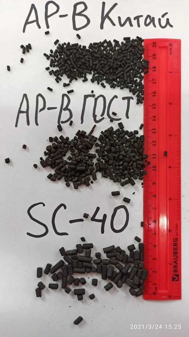 "Гранулированный рекуперационный активный уголь АР-В". Наименование показателя Норма Внешний вид угля активного АР-В Цилиндрические гранулы темно-серого или черного цвета Основной размер частиц, мм 2, 8 - 5, 0 Прочность гранул на истирание, %, не менее 75 Насыпная плотность, г/дм3, не более 600 Равновесная активность по толуолу, г/дм3, не менее 110 Массовая доля влаги, %, не более 10