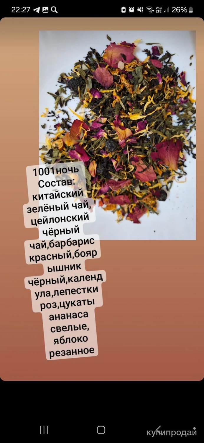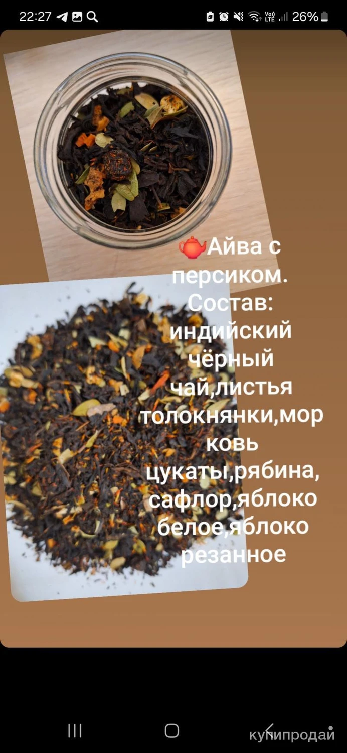 ? УЛУН МОЛОЧНЫЙ Состав: китайский зелёный чай улун, обработанный молочным экстрактом ? 1001 НОЧЬ(смесь чёрного и зелёного чая) Состав: китайский зелёный чай,цейлонсккий чёрный чай,барбарис красный,боярышник чёрный,календула,лепестки роз,цукаты ананаса светлого,яблоко резанное . ? ГЕЙША ( зелёный чай) Состав: китайский зелёный чай, календула, курага резанная, хризантема белая, цветки лилии,цукаты ананаса светлые. ? АЙВА С ПЕРСИКОМ ( ЮЖНАЯ ИНДИЯ) Состав: индийскиий чёрный чай, листья толокнянки, морковь цукаты, рябина, сафлор, яблоко белое , яблоко резанное. ? 1002 НОЧЬ Состав: индийскиий чёрный чай, календула, кожура шиповника, мелкие лепестки розы, цукаты ананаса светлые . ЧЁРНЫЙ С ВИШНЕЙ Состав, индийскиий чёрный чай, вишня вяленая, рябина . ? МИЛЫЙ ФРУКТ . Состав: вишня сушёна.