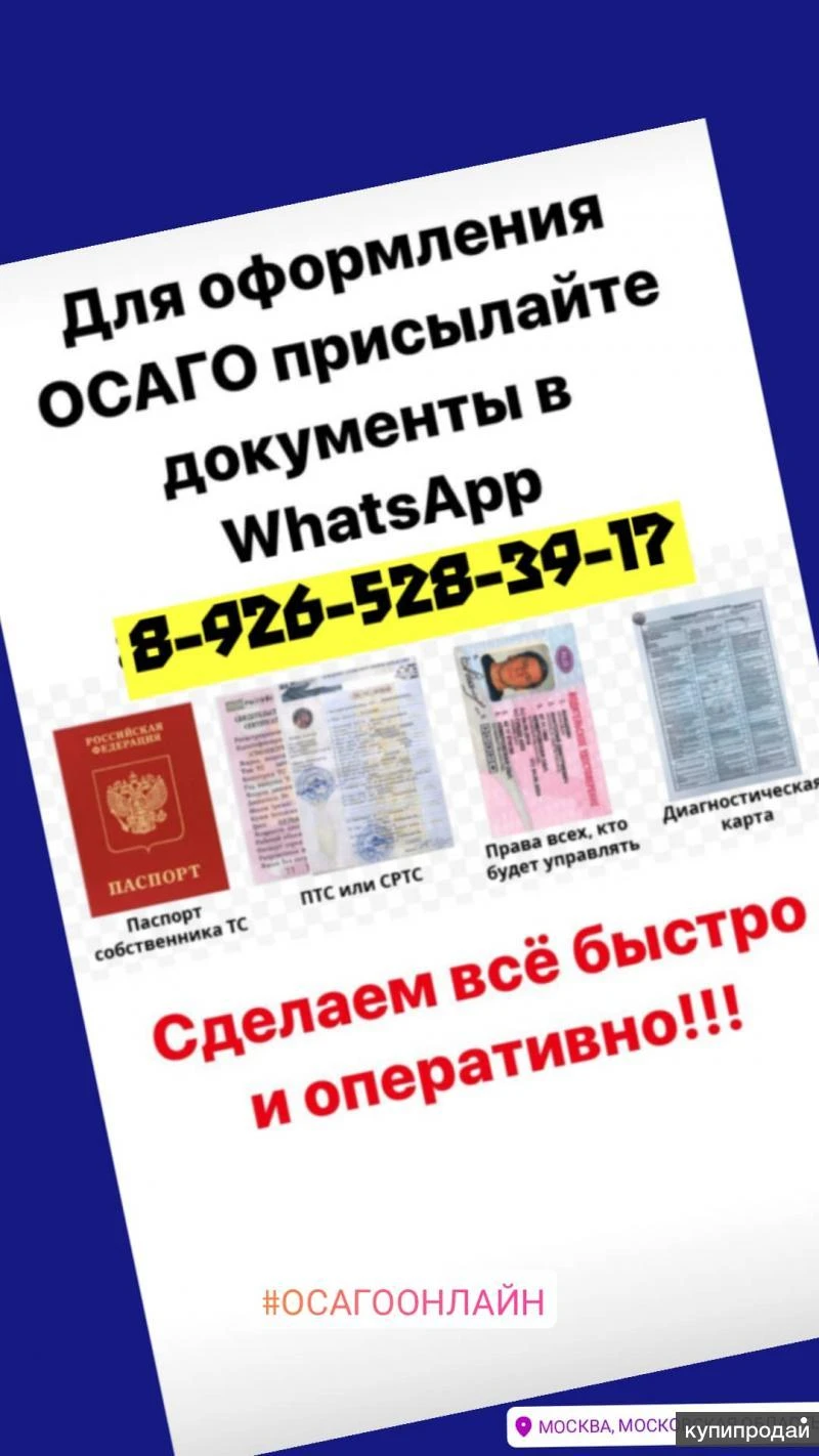 СТРАХОВАНИЕ НЕ ВЫХОДЯ ИЗ ДОМА - ПОЧЕМУ ЭТО ВЫГОДНО ? Вы экономите время и деньги на поиски выгодных условий,на поездки и ожидании очередей при оформлении. Оформление без дополнительных услуг. Сохранение/предоставление дополнительных скидок,бонусов за без аварийную езду по предыдущим договорам ОСАГО и КАСКО. Сопровождение/внесение изменений по договору страхования в течении срока действия бесплатно. Оплата по ссылке напрямую в страховую компанию. После оплаты получаете заверенный эл.подписью оригинал полиса на эл.почту /WhatsApp /Telegram . Для расчета и оформления КАСКО/ОСАГО необходимо направить пакет документов на эл.почту или WhatsApp /Telegram : Паспорт собственника с пропиской, ПТС,СТС,Вод.удостоверения всех допущенных лиц к вождению,предыдущий полис/договор(при наличии). Помощь в прохождении техосмотра, с оформлением диагностической карты по новым правилам. Станции ПТО Москвы и регионов на специальных условиях, для авто категории В/С - M1, N1, N2, N3, L, O1, O2, O3, O4., по ПРЕДОПЛАТЕ.. Официально, с занесением в базу,с последующей проверкой. Диагностическая карта подходит для постановки на учет,такси.