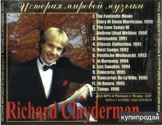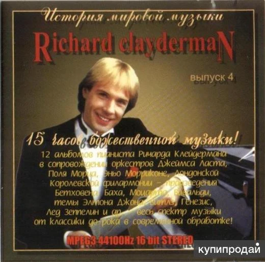 Предложение для коллекционеров и любителей хорошей музыки ! ПРОДАЮ 1 музыкальный диск в формате аудио MP3 - 15 часов божественной музыки - 192 песни - выпуск 4 из 12 альбомов на каждом порядка 12-17 песен пианиста Richard Clayderman Ричарда Клейдермана в сопровождении оркестров Джеймса Ласта, Поля Морца, Эньо Морриконе, Лондонской Королевской филармонии - произведения Бетховена Баха, Моцарта, Вивальди, темы Элтона Джона, Битлз, Генезис, Лед Зеппелин и др. Весь спектр музыки от классики до рока в современной обработке. ЦЕНА 3000 рублей в Сыктывкаре. Возможен пересыл в любой город за Ваш счёт.