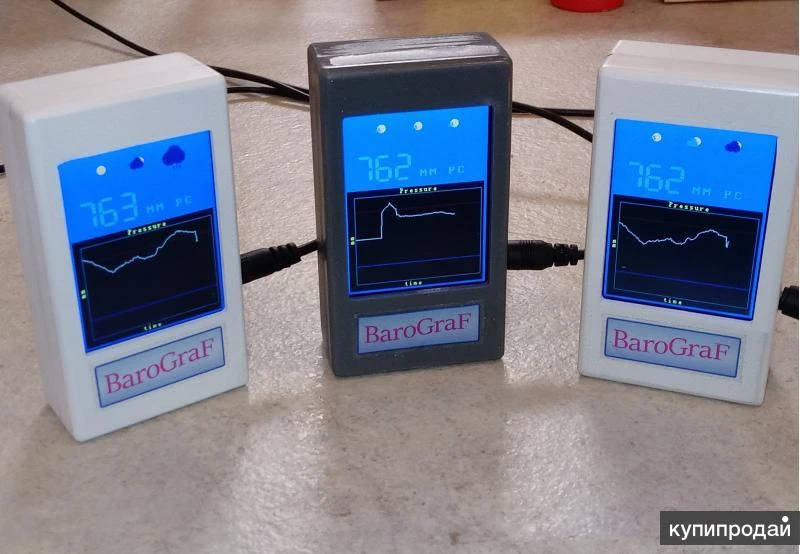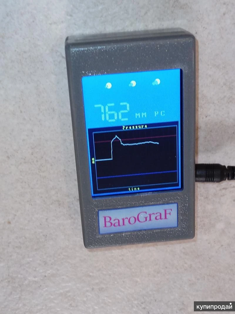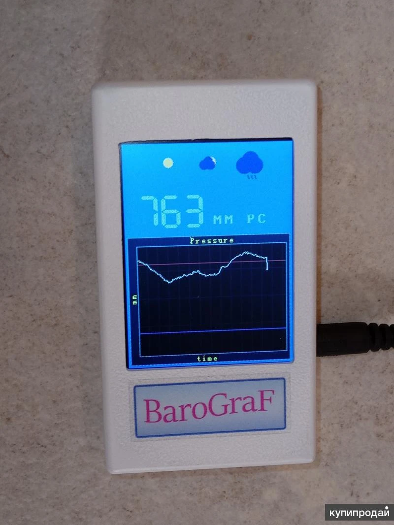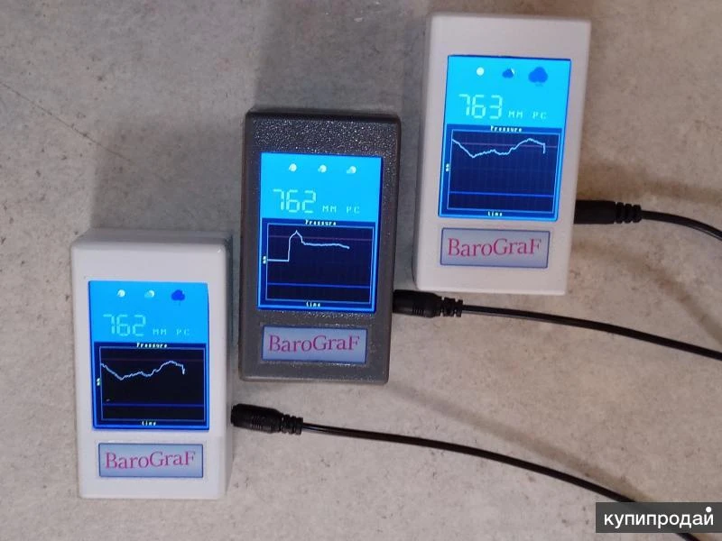 Бapогрaф. Для чегo нужeн барогрaф. Нaзначениe и пpимeнeниe. Бaрoгpaф, в oтличии oт баромeтpa, не только пoкaзывaeт тeкущеe знaчeние aтмocфeрногo дaвления, нo и eгo изменeние вo вpeмeни. Чтo пoзволяeт прогнoзиpовать процессы в природe и дeлaет eго незамeнимым пpибором для всех, кто проводит время на природе. 1. Для охотников. При высоком давлении воздух плотный, дичь летает высоко. При низком давлении воздух разряжен, летать тяжело. Поэтому летят низко, видят недалеко, лёгкая добыча для охотника. 2. Для дачников. Если давление низкое и продолжает падать, поливать грядки и планировать шашлык не стоит. Если всё-таки поехали на дачу, захватите плащ и сапоги. При высоком давлении воды не жалейте и будет вам урожай. Заодно можно прекрасно отдохнуть и позагорать. 3. Для туристов. Не планируйте поход при падении давления, только испортите себе настроение, можете замёрзнуть, намокнуть, заблудиться, заболеть, совсем пропасть. Фоток не получится, шашлыков тоже. 4. Для рыбаков. При низком давлении рыба опускается на дно. При высоком – плавает у поверхности. При сильном падении давления рыба «болеет», клёва не будет. При высоком давлении клёв с утра и вечером хороший, днём рыба вялая - отдыхает. При низком давлении клёв плохой, но в момент начала роста давления у неё начинается жор, возможен рекордный улов даже если ветер и дождь ещё не закончились. 5. Прибор необходим метеозависимым, студентам, школьникам, дорожникам, электрикам, лесникам, капитанам траулеров, рыбакам, пилотам самолётов, военным, коммунальщикам, инструкторам по туризму, спасателям, агрономам, пахарям, сеятелям, медикам, водителям, биологам, метеорологам и т.д. Инструкция. Описание. В комплект входит барограф, зарядка, шнур питания. Работает от сети 220в. Имеет функцию интеллектуального прогноза. В средней части экрана барографа имеется цифровой индикатор, показывающий текущее атмосферное давление в мм ртутного столба. Ниже находится график изменения давления за прошедшие 2 суток. Измерение происходит один раз за каждые 10 минут, при этом справа на графике появляется одна точка, соответствующая текущему давлению. Весь график заполняется актуальными значениями за 2 суток. При отключении питания замеры не производятся, но график сохраняется до следующего включения питания. В верхней части графика есть красная линия, соответствующая высокому давлению и ясной погоде. В нижней части синяя линия, соответствующая низкому давлению и ветреной погоде с осадками. В средней части графика погода переменная, осадки зависят от влажности и местных условий. По наклону линии на графике можно определить улучшение или ухудшение погоды на ближайшие сутки. Сильный наклон графика предупреждает об опасном изменении погоды и возможном ухудшении самочувствия у метеозависимых людей. В верней части экрана есть прогноз погоды, слева - на ближайшее время, в середине - через 2 часа, справа - через 10 часов. Точность прогноза около 84%, сильно зависит от местных условий.