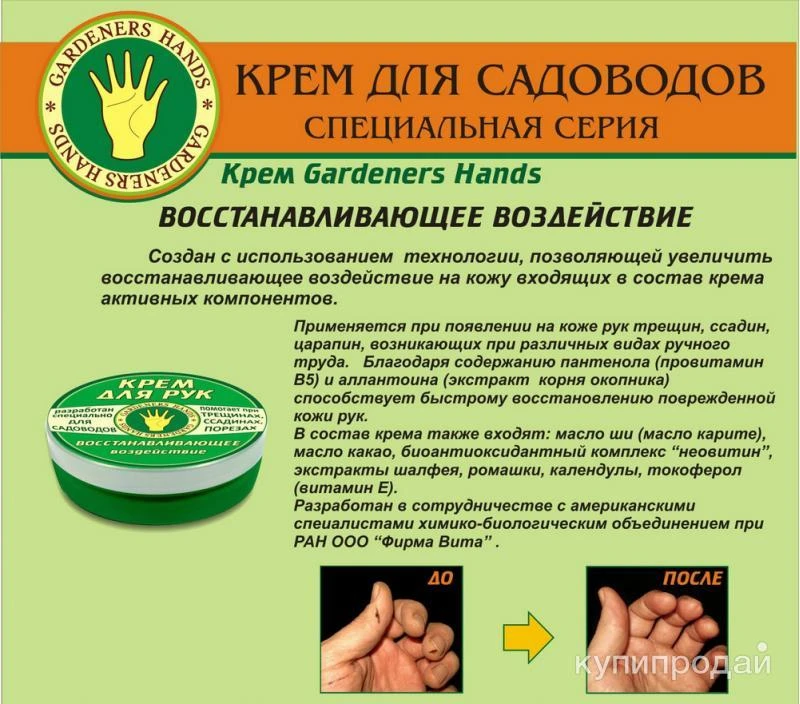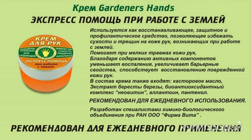 Крем GARDENERS HANDS Экспресс помощь Разработан специально для работы в неблагоприятных климатических и погодных условиях, для работы с землей, для садоводов-огородников. Профилактический и Защитный. Позволяет избежать сухости и трещин на коже рук. Помогает при мелких травмах Применяется перед работой с землей и прочими загрязнениями. 450р Крем GARDENERS HANDS Восстанавливающий Разработан специально для работы в неблагоприятных климатических и погодных условиях, для работы с землей, для садоводов-огородников. Увлажнение, смягчение, заживление, регенерация. Применяется после работы с землей и прочими загрязнениями. 550р По вопросам розничных и оптовых поставок +7 (911) 703-08-00