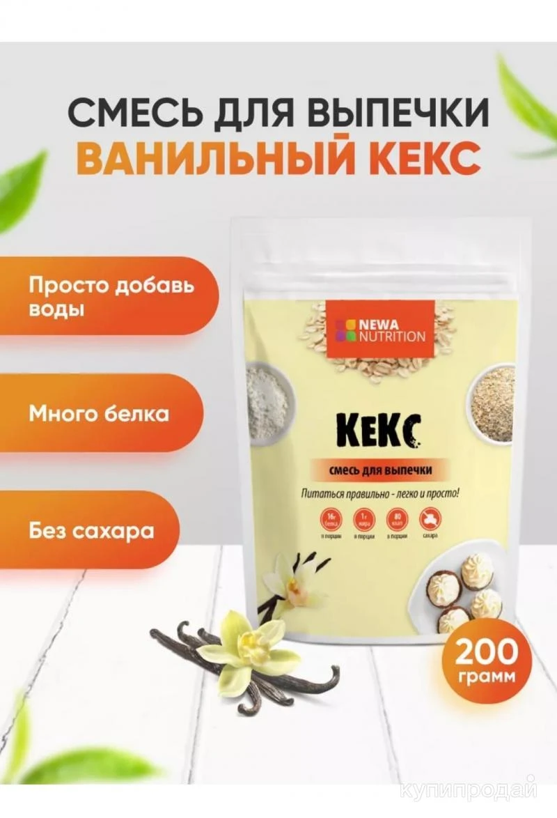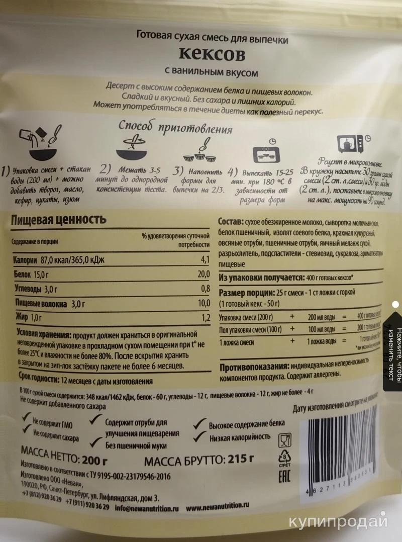 ⭐Готовая сухая смесь для выпечки Кексов. ?Десерт с высоким содержанием белка и пищевых волокон. ?Этот полезный кексик сочетает в себе немыслимое удовольствие от вкуса и отсутствие вины от поглощения сладкого, да он малокалорийный и подойдет всем тем, кто следит за своим силуэтом и здоровьем! ?️Преимущества: ⭐Высокое содержание белка ?Без пшеничной муки ?Не содержит ГМО ◽Низкая калорийность ◽Не содержит сахара ♻️Состав: Сухое обезжиренное молоко, сыворотка молочная сухая, белок пшеничный, изолят соевого белка, крахмал кукурузный, овсяные отруби, пшеничные отруби, яичный меланж сухой, разрыхлитель, сода, подсластители - стевиозид, сукралоза, ароматизаторы пищевые. ?Вкусы: ?Шоколад ?Ваниль ?Порция: ◽25г смеси - 1 столовая ложка с горкой (1 готовый кекс - 50г) ◽Из упаковки получается: 400г готовых кексов ?Пищевая ценность (в порции 25г): ◽Белки _ 15г ◽Жиры _ 1г ◽Углеводы _ 3г ◽Пищевые волокна _ 3г ◽Калории _ 87ккал ✅Способ приготовления: ◽Соединяем равные порции по объёму смеси и воды + можно добавить творог, масло, кефир, цукаты, изюм ◽Мешать 3-5 минут до однородной консистенции теста ◽Наполнить формы для выпечки на 2/3 ◽Выпекать в духовке 15-25 минут при 180° в зависимости от размера форм ◽Рецепт в микроволновке: В кружку насыпьте 30г сухой смеси (2 ст.л) и 30г воды (2 ст.л), перемешать. Поставьте в микроволновку на макс. мощность на 90 секунд. Страна производителя: Россия Бренд: NEWA Nutrition ?Доставка: Самовывоз, СПБ, Россия, СНГ (СДЭК, Почта России, Яндекс доставка/курьер и пункты выдачи, Сберлогистика, Boxberry, 5post) ?Оплата: Безопасная сделка, наличными, онлайн перевод