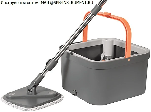 В комплект входят: швабра квадратная, ручка, насадка - 2 шт., ведро 2,6 л. с системой отжима. Материал: микрофибра, нержавеющая сталь, полипропилен.