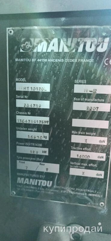 Серьезная машина для тяжелых грузов. Год выпуска 2007. Наработка 2155 м.ч. Идеальное состояние. Один собственник. Один машинист-оператор за время эксплуатации. Все ТО проведены. Погрузчик храниться и работал в помещении дилера Manitou. За территорию площадки не выезжал, в аренде не был. Приобретался для собственных разгрузочно-погрузочных работ - Грузоподъемность: 12000 кг - Наибольшая высота подъема: 9,62 м - Максимальный горизонтальный вылет стрелы: 5,35 м - Гидростатическая трансмиссия - Корректор выравнивания рамы - Двигатель MERCEDES OM 904 - 175 л.с./129 кВт - Автоматическое отключение «опасных» движений - Гидравлическая линия на стреле. Обратный слив. - Зимний комплект, подогрев двигателя и гидравлики, 155 аккумулятор В комплекте: - Каретка для вил TFF MT / 1430. Вилы 200*70*1800 мм - Крановая лебедка грузоподъемностью 12 тонн MANITOU Альтернатива автокрана. Мобилен и эффективен на разгрузке и при монтаже тяжелого оборудования в помещениях. Прямая продажа. Цена с НДС. Приглашаем на Тест-драйв