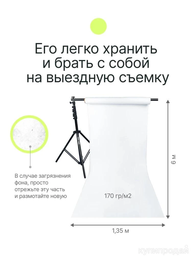 Где недорого купить небольшой белый бумажный фон? Купить недорого небольшой белый бумажный фон в Томске просто - магазин фототоваров ФотоТом ул. Никитина 17 (вход с Никитина). Большой выбор цветных бумажных фонов различных размеров и систем их подвеса, крепления в наличии в Томске. Доступна покупка через Авито ( на нашем сайте в карточке товара есть кнопка Купить этот товар через Авито. Просто, безопасно и удобно. Кликаем, переходим, оформляем.) Фон бумажный Raylab 008 Arctic White 1,35х6м белый Бумажные фоны – номер один в профессиональных студиях. Бумажный фон практически не имеет текстуры, поэтому ничто не будет отвлекать от объекта съемки, он матовый и значит, свет ляжет равномерно, без бликов. Фон достаточно плотный и упругий, чтобы все переходы, в том числе от стены к полу, были плавными. Узкие фоны 1.35х6 – лучшее решение для предметной выездной съёмки, в небольших студиях и дома. Они компактнее, легче, дешевле и не требуют больших держателей фонов или сложных систем. Белый бумажный фон Материал: бумага Цвет: белый Основной цвет: белый Размер, см: 135х600 см. Плотность (г/м2):155±5 Основной цвет: белый Тип фона: Бумажный Вес в упаковке, кг: 2.25 Вес без упаковки: 2.1 кг Размер в упаковке: 1,35х0,06х0,06 м Бренд RAYLAB Страна производства Китай Гарантия 1 месяц Форма оплаты любая. Производим доставку по России. Доступна покупка через Авито Самостоятельно в Томске купить недорого небольшой белый бумажный фон в Томске просто - магазин фототоваров ФотоТом ул. Никитина 17 (вход с Никитина). Большой выбор цветных бумажных фонов различных размеров и систем их подвеса, крепления в наличии. Наличие, актуальные цены уточняйте. Сайт ФотоТом https:// phototom.ru/