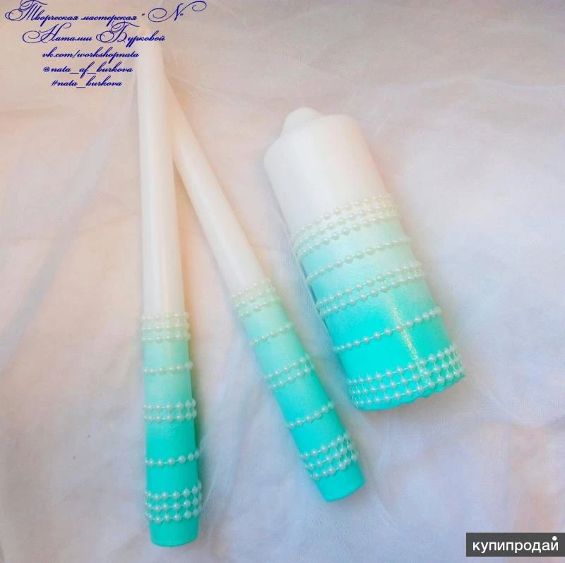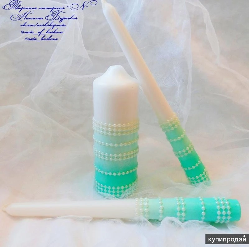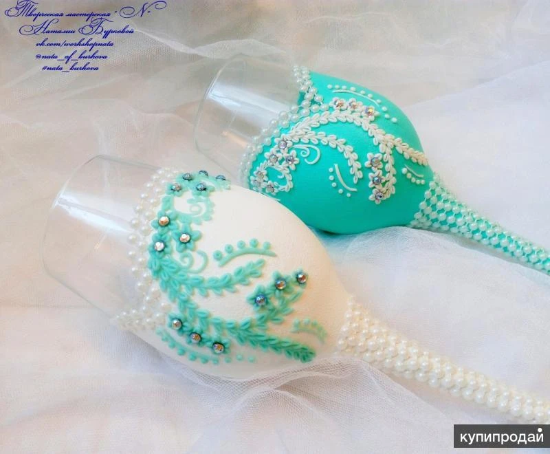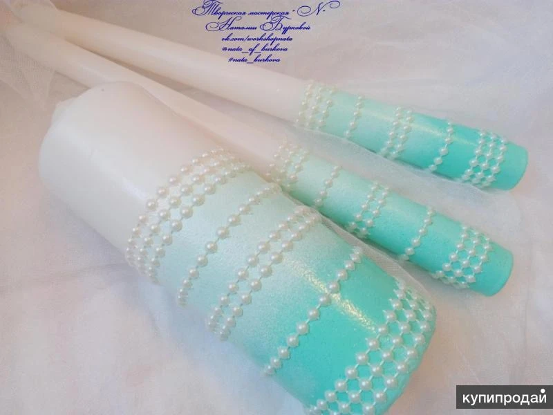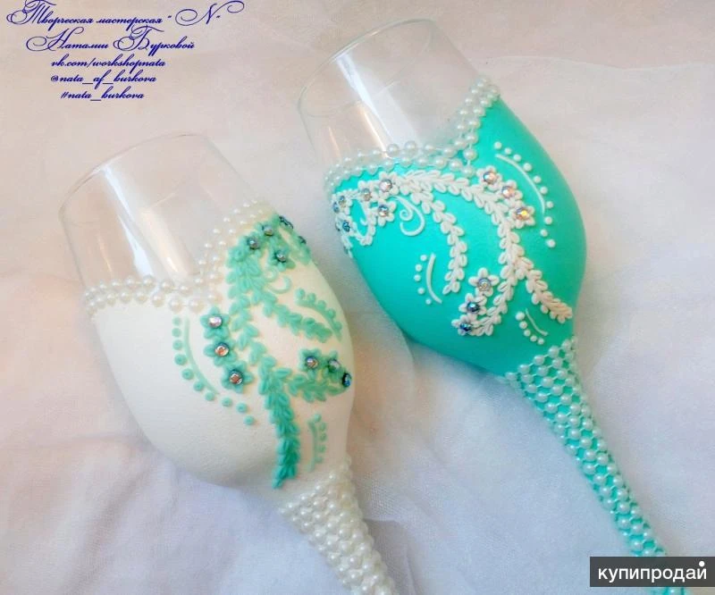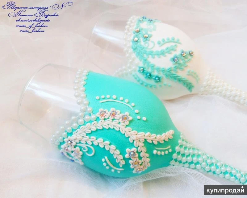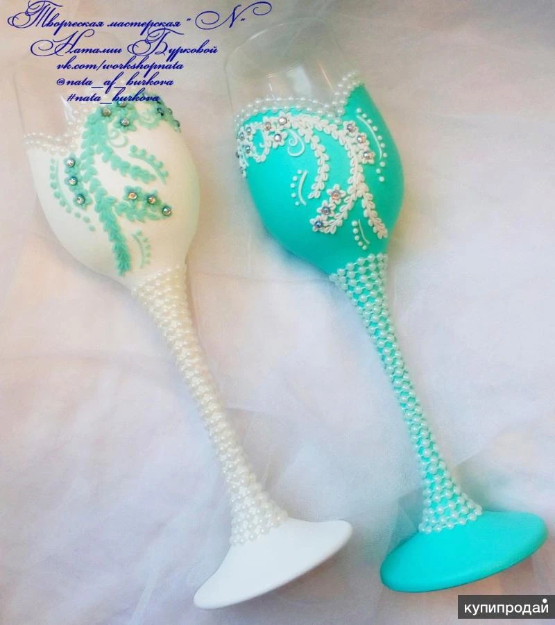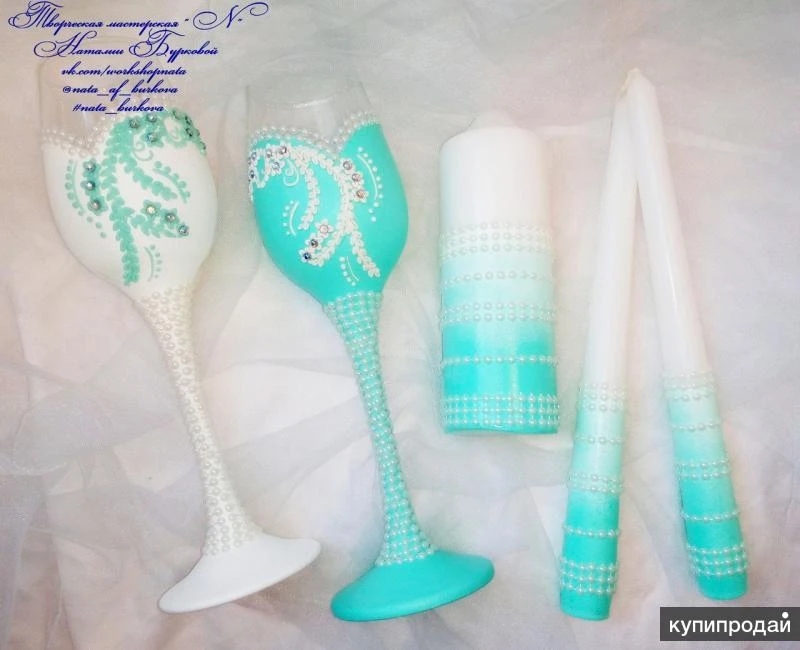 Очень красивый набор, в бело-мятном цвете, фото к сожалению не передает всей утонченности и элегантности этого наборчика( Бокалы на высоких, тонких ножках декорированных нитью из полубусин, окрашены акрилом , декор из полимерной глины, вылеплен в ручную, центр цветочков украшают стразинки. Семейный очаг ( 2 тонкие свечи и одна столбик) так же окрашены акрилом, украшены нитью из полубусин. По Вашему желанию можно дополнить этот набор, подушечкой для колец и шампанским ( бутылки Ваши) Если заинтересовало, пишите) Я всегда отвечаю) Всем отличного настроения)))
