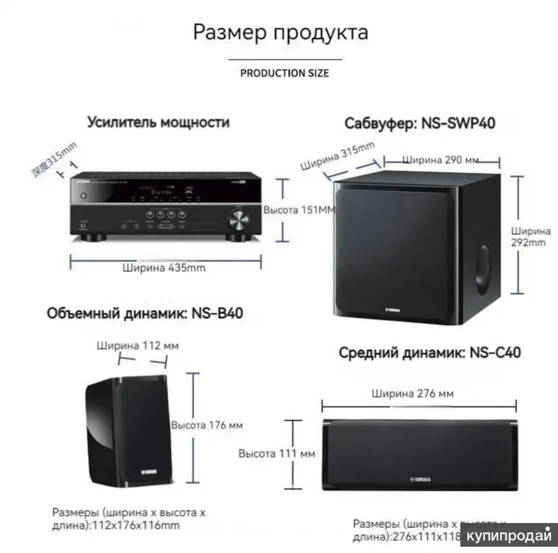 5.1-канальный спутниковый домашний кинотеатр YAMAHA YHT-1840 новинка Характеристики Добавить к сравнению Тип Домашний кинотеатр Тип усилителя Гибридный Максимальная мощность, Вт600Звуковая схема5.1Макс. частота, Гц25000ИнтерфейсыОптический аудио (Toslink)Мощность сабвуфера, Вт100БрендYamahaЦветЧерныйМощность тыловых колонок, Вт200Мин. частота, Гц30Отношение сигнал/шум, дБ83Подключение сабвуфера Проводное Беспроводные интерфейсыBluetooth, Wi-FiЧисло портов HDMI5Декодеры звукаDolby Digital IIФорматы воспроизведенияACC, AIFF, MP3, MPEG-4 AVC, WMA, WMVРазмер фронтальных колонок, см11.2*17.6*11.6Размер центрального канала, см27.6*11.1*11.8Размер тыловых колонок, см11.2*17.6*11.6Размер сабвуфера, см29*29*31.5Материал корпуса Пластик Страна-изготовитель Малайзия NOBLESTYLE Store