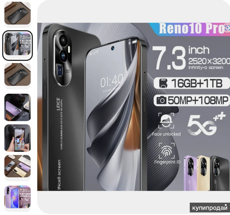 Смартфон Русский смартфон Reno10 pro+ 7,3 дюйма смартфон OPPO Reno10 pro+ Золотой, черный, фиолетовый Поддержка Google Play Характеристики Добавить к сравнению Камера Разрешение основной камеры, Мпикс72Функции камеры Автофокус, ВспышкаСтабилизацияOIS (оптическая стабилизация)Количество основных камер2Макс. разрешение фронтальной (передней) камеры, Мпикс48Качество видео1280×1024 SXGAМакс. скорость видеосъемки, кадр/с60ФункцииАутентификацияРаспознавание лица, Сканер отпечаткаИнтерфейсыUSB Type-CСлот для карты памяти Да Функции зарядки Поддержка быстрой зарядки Связь Беспроводные интерфейсыBluetooth, GPS, Wi-FiСтандарты связи2G, 3G, 4G (LTE)Форм-фактор SIMMicro-SIM, Nano-SIMЧисло SIM-карт2Модуль связи Bluetooth4.0Модуль связи WiFi802.11 a/b/g/n/ac/ax, 802.11a/b/g/nНавигацияA-GPS, GPSОбщиеЕмкость аккумулятора, мАч7800Основной материал корпуса Металл, Пластик, Стекло Операционная системаAndroidВерсия AndroidAndroid 13.xОсобенностиБезрамочный дисплей Тип корпуса Моноблок Размеры, мм185*90*50Вес товара, г400Гарантийный срок один год Заводские данные Степень защитыIP60ЭкранДиагональ экрана, дюймы7.3Разрешение экрана1072х1448Технология матрицыDynamic AMOLED 2XПамять и процессорПроцессорSnapdragon 888 Plus (8 ядер), 2.99 ГГц Число ядер процессора10Оперативная память16 ГБ Встроенная память512 ГБ Тип карты памятиmicroSD, nanoSDБренд процессораQualcommМодель процессораSnapdragon 888Частота процессора, ГГц2Бренд графического процессораAdrenoВидеопроцессорAdreno 660Макс. объем карты памяти, ГБ128ДополнительныеТипСмартфонЦветЗолотой, черный, фиолетовый Поддержка eSimSIM (без eSIM)Страна-изготовитель Китай NOBLESTYLE Store
