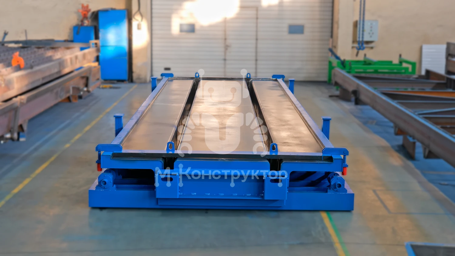 В металлоформах, изготовленных заводом «М-Конструктор», предусмотрен выпуск плит ТТ с возможностью переналадки по длине. Форма одноместная, оснащена силовой рамой для работы с преднапряжённой арматурой, силовыми упорами и защитными кожухами на торцах.