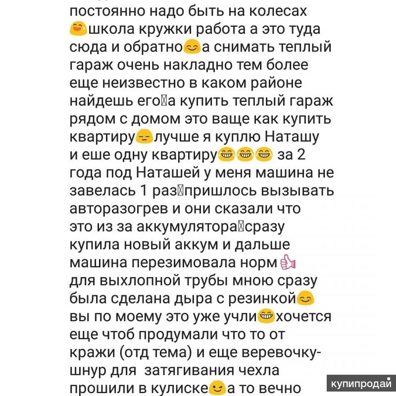 Портативный гараж Наташа для автомобиля, разработан профессионалами специально для сибирских морозов! На рынке с 2010 года. Больше отзывов в нашем инстаграме mobile_garage. Портативный гараж Наташа для автомобиля, разработан профессионалами специально для сибирских морозов! Очень полезная вещь для длительных стоянок в условиях отрицательных температур, достаточно накинуть такой чехол на прогретый автомобиль, который очень медленно остывает по таким одеялом + защита от снега и ветра. По своим характеристикам работа портативного гаража Наташа подобна работе термоса, температура под ним со временем падает. Эффективен при минус 50 и ниже! Всегда в наличии на разные авто Вес: 10 -14 кг